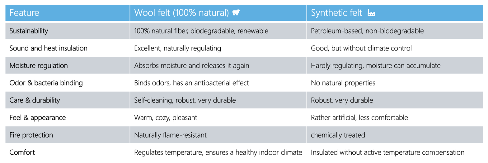 Our overview below shows how much more natural, healthier, and more durable wool felt is compared to synthetic fibers.