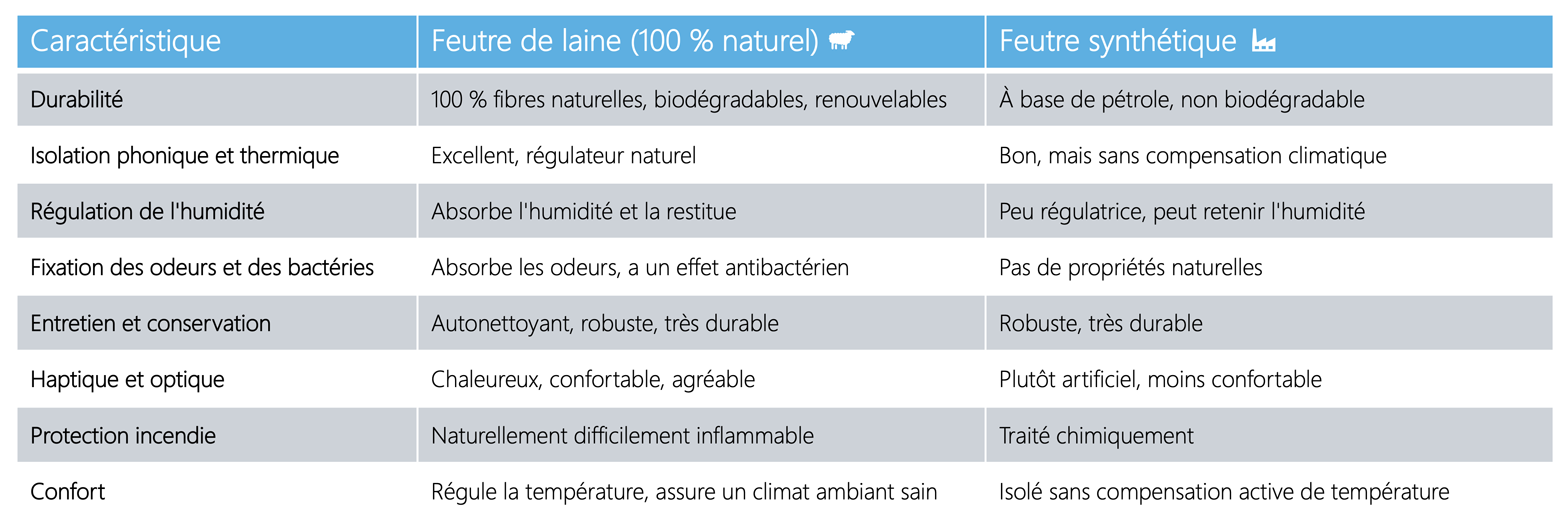 Notre aperçu suivant montre à quel point le feutre de laine est plus naturel, plus sain et plus durable que les fibres synthétiques.