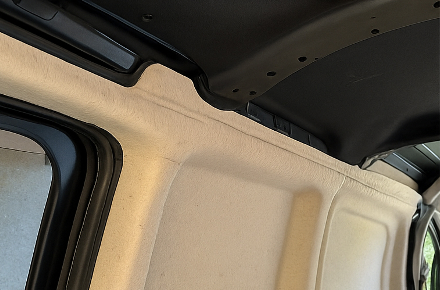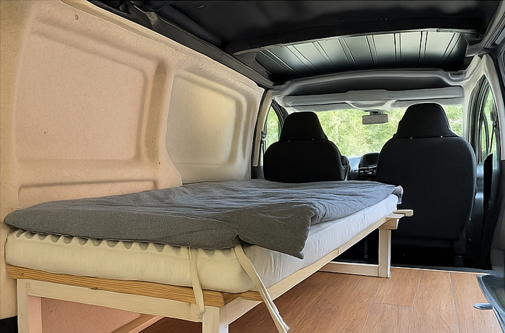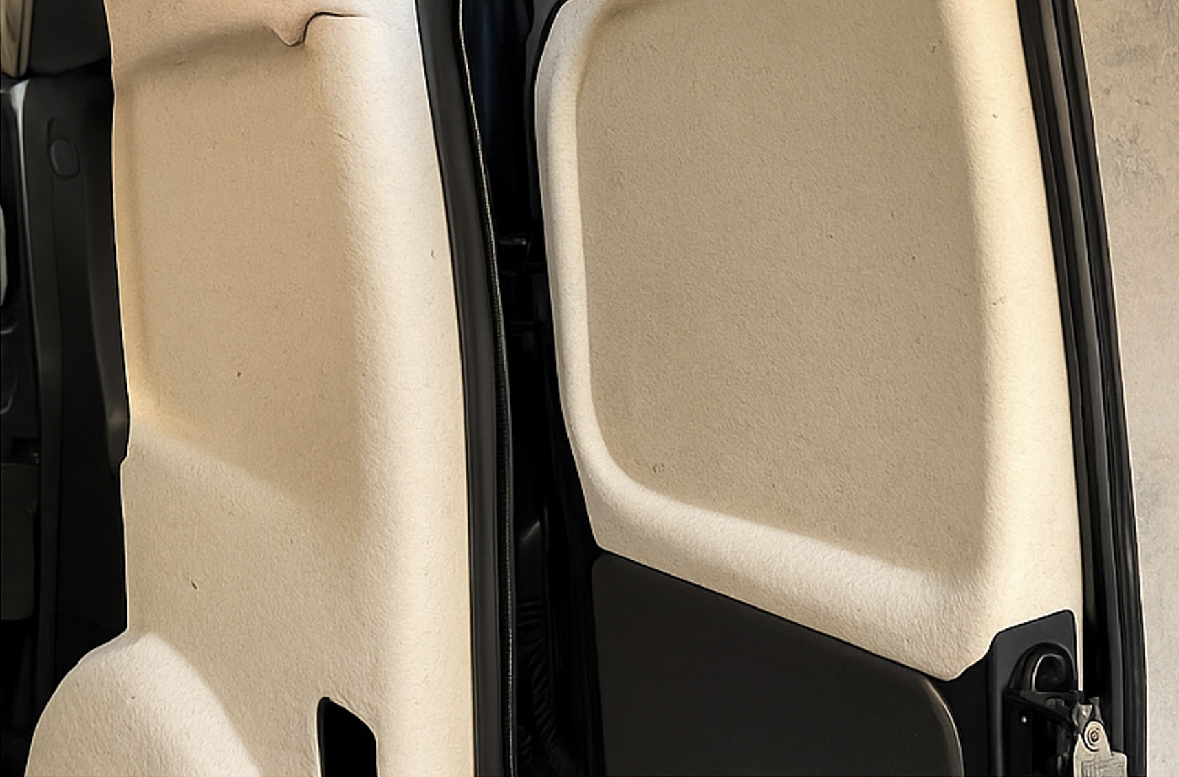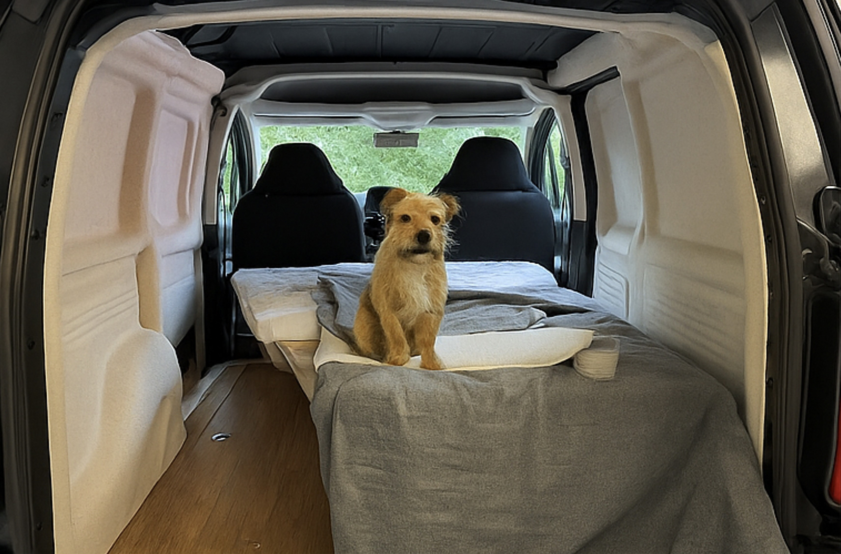 Aménagement d'un Opel Combo Kasten XL avec du feutre naturel de différentes épaisseurs pour les parois, les portes et les passages de roues – en compagnie de Nala, fidèle compagne de voyage.